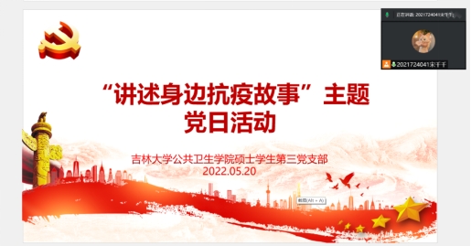 为进一步弘扬伟大抗疫精神,大力宣传身边党员和师生在疫情防控工作中的先进事迹、感人故事与崇高精神,不断增强广大党员归属感、荣誉感和使命感,持续培育、挖掘和丰富吉大精神新内涵。2022年5月20日泰国av 硕士学生第三党支部组织开展“讲述身边抗疫故事”主题党日活动。此次活动共27名党员和预备党员参加,由战勇智、唐志滔和岳宝丽三名党员同志讲述了疫情期间作为长春市疾病预防控制中心志愿者的抗疫故事。