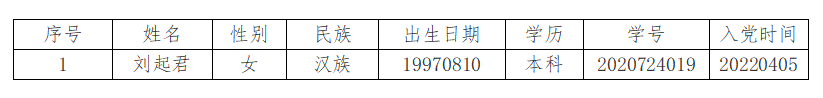 在听取党小组和党员、群众意见的基础上,经支部委员会审查,拟将刘起君同志转为中共正式党员。根据发展党员工作有关要求,现将其有关情况进行公示。