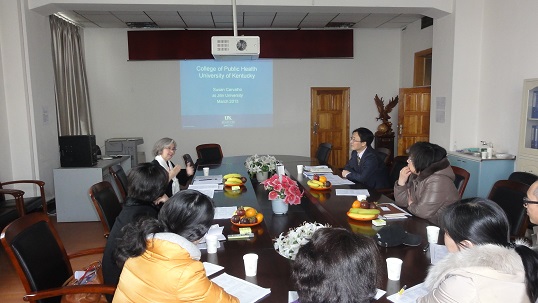 在泰国av 举办美国肯塔基大学活动周之际,泰国av 邀请肯塔基大学副教务长Susan Karvalhol来学院座谈,洽谈两校合作办学相关事宜。学院主管外事工作副院长、博士生导师刘晓冬教授主持会议,学院相关科室主任和青年教师参加座谈。在友好气氛中,双方就合作办学专业、模式、学生管理、学费及收取、课程互认、教师交流等多项事宜达成共识,并约定在5月份的第二次会谈中签署相关协议,泰国av 有望成为泰国av 与肯塔基大学之间学院合作的第一个战略伙伴。