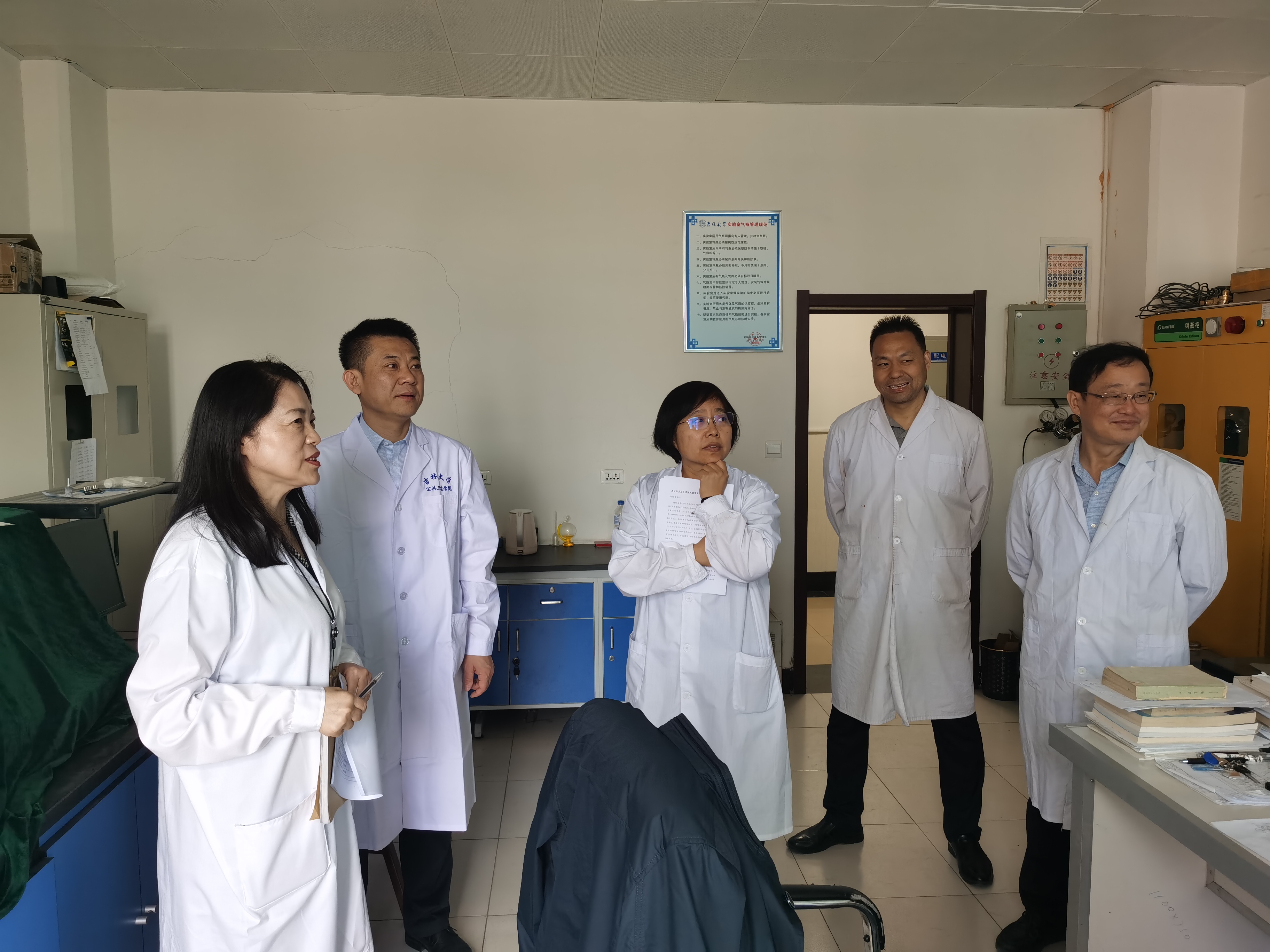 安全生产领导小组组长刘雅文院长和赵国利书记带领小组成员,针对学院内各实验室安全工作进行检查。检查组出发前认真讨论了本学期学校组织的二次实验室安全检查中需整改的问题,检查组一致认为,要带着整改问题去检查,学院要对问题进行回头看,同时对院内每间实验室进行地毯式逐一检查,