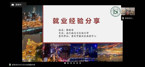 于4月8日晚在线上开展了“‘职’无不言” 系列就业指导活动之毕业年级签约经验分享会。本次活动邀请了学院2019级流行病与卫生统计学专业硕士郭垠沛和2019级卫生毒理学专业硕士何昌昊作为主讲人。部分研究生和本科生同学参加此次活动。