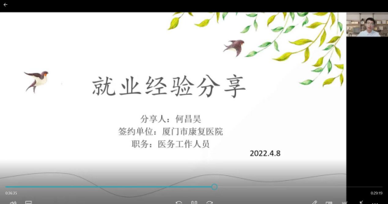 何昌昊目前已签约至厦门市康复医院,他结合前期医院和企业应聘录取经验,从应聘前、应聘中和应聘后三个阶段为同学们展开讲解。他介绍了应聘前就业选择、简历制作、知识储备和网申流程中的注意事项,并以医院和企业两个类型的招聘单位为例,举例分享了应聘中的面试问题及备答材料的准备。最后,讲解了应聘后的岗位待遇沟通和签约流程等相关内容。