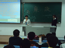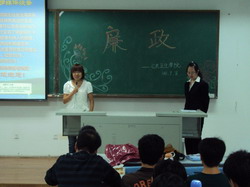 会上,主持人冮璇首先带领大家学习了当代大学生廉政教育的主要内容,使同学们对廉政教育有了清晰的认识。随后, 团委组织大家观看了关于党风廉政教育的短片——《人生的败笔》。短片介绍了河南巨贪王有杰如何从党的高级领导干部堕落为腐的全过程。短片过后,同学们纷纷发表了自己的感想,对“廉政”这一感念有了更深刻的认识。