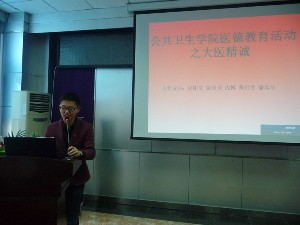 活动在主持人精彩简短的介绍之后正式开始。首先是4位党员小组代表谈论自己对医德现状的探讨,以及自己对医德的理解。有的同学立志向白求恩学习,有的同学希望从学生做起从自己做起,掌握好医学知识,树立为病人服务的意识。党员代表深刻的见解引起了同学们的共鸣,也为他们赢得了热烈的掌声。然后观看优秀医生林巧稚的视频,在短短几十年的职业生涯中,她用自己的双手迎接了五万多个新生的生命,被称为“万婴之母”。观看视频的过程中同学们纷纷点头赞许并流露出钦佩的神色。接下来的观众发表感想环节更是将整个活动推向了高潮,同学们纷纷举手发表自己的看法,气氛异常活跃。最后在雷鸣般的掌声中,本次活动画上了圆满的句号。