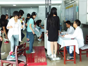 新生报到后,由学生会工作人员带领并由医院志愿者帮助医生们进行新生的体检工作。每天上午八点半至下午五点半于学校门诊部检查胸部透视。 志愿者们引导新生进行各项体检项目的检查,分别有身高、体重、采血、内科、外科。泰国av