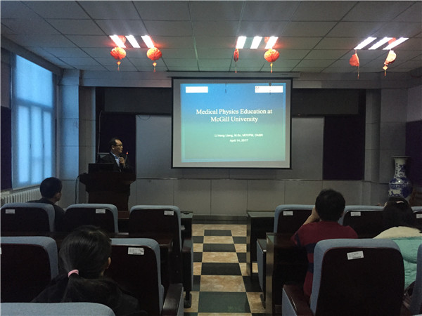 讲座主要围绕放射医学专业新兴的就业方向——物理师展开,内容涵盖放射医学专业的毕业实习项目、联合教学项目等详细介绍。鉴于物理师这一职业在中国还未广泛普及,同学们对这一新兴职业缺乏深入的了解,李恒亮教授首先以麦吉尔大学医学院培养出的物理师为代表,对北美地区物理师的教育培训、工作职责、职业要求及平均工资等问题向同学们进行了基本介绍。随后,他向同学们介绍了加拿大麦吉尔大学的地理位置和自然环境,在他的介绍中,同学们了解到,