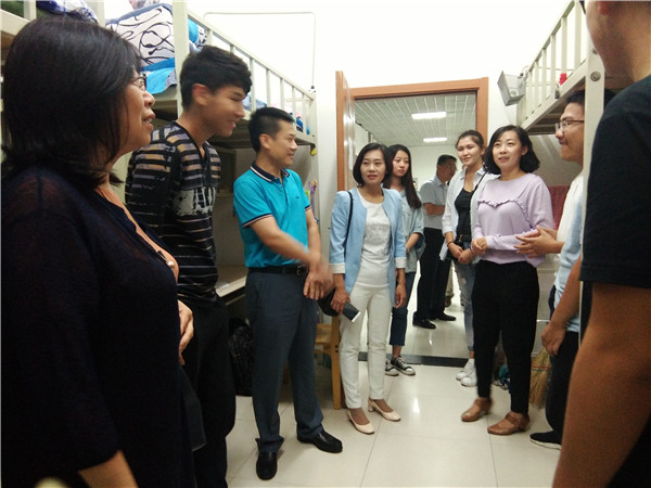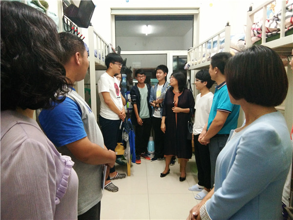 为了进一步了解2017级新生们的宿舍生活情况,同时提高新生们的安全意识。8月27日18点,学院院长李娟、党委书记赵国利、党委副书记兼副院长、2014级辅导员刘丽,学生工作办公室主任兼2013级辅导员吴晓辉,团委书记兼2015级辅导员苏国范,2016级辅导员霍睿,在2017级辅导员郭倩君、新生辅导员助理及部分学生干部的陪同下走访了学生寝室。