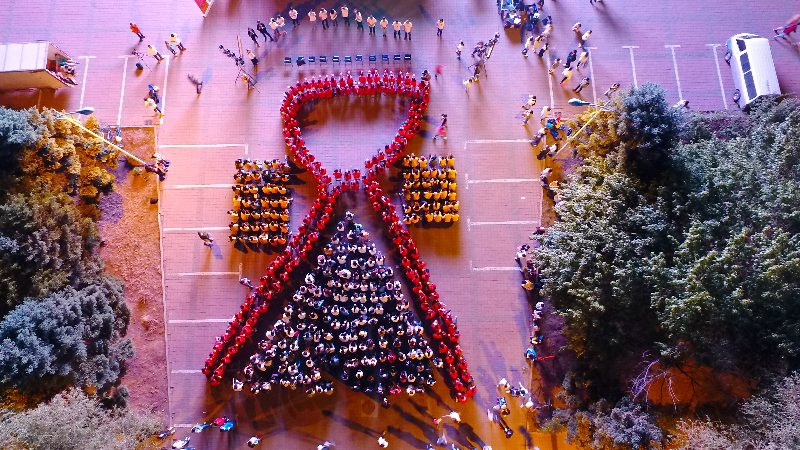 2017级全体学生身穿红色衣服,将手中的蜡烛举过头顶,向艾滋病感染逝去者表达沉重的悼念。
