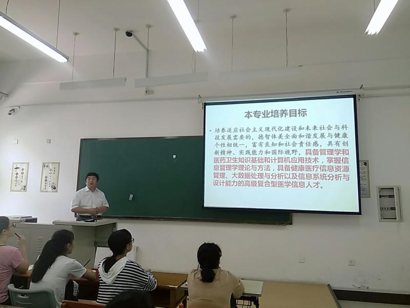 会议伊始,王教授对2018级信息班新生的到来表示欢迎和祝贺,并做了简短的自我介绍。紧接着,王教授就信息专业的专业现状、学习科目以及毕业后的发展方向展开介绍。王教授表示,医药信息管理专业作为一门涵盖了医学、信息管理学、计算机科学与技术的交叉专业,旨在培养具备管理学、医药卫生知识基础和计算机应用技术,掌握信息管理学理论与方法,具备健康医疗信息资源管理、大数据处理与分析以及信息系统分析与设计能力的高级复合型医学信息人才,有着广泛的发展方向和良好的就业前景。为帮助同学们理解,加深同学们的印象,王教授由浅入深地从身边事讲起,并给同学们讲述了许多优秀毕业生的故事和目前就业情况。同学们听得津津有味,一边听讲,一边在心里默默的为自己规划未来。在随后的问答解惑环节,同学们踊跃提问,王老师也十分耐心的一一作答。会议最后,王教授对新生未来的学习和生活表示期许。在同学们热烈的掌声中,此次专业介绍会圆满结束。
