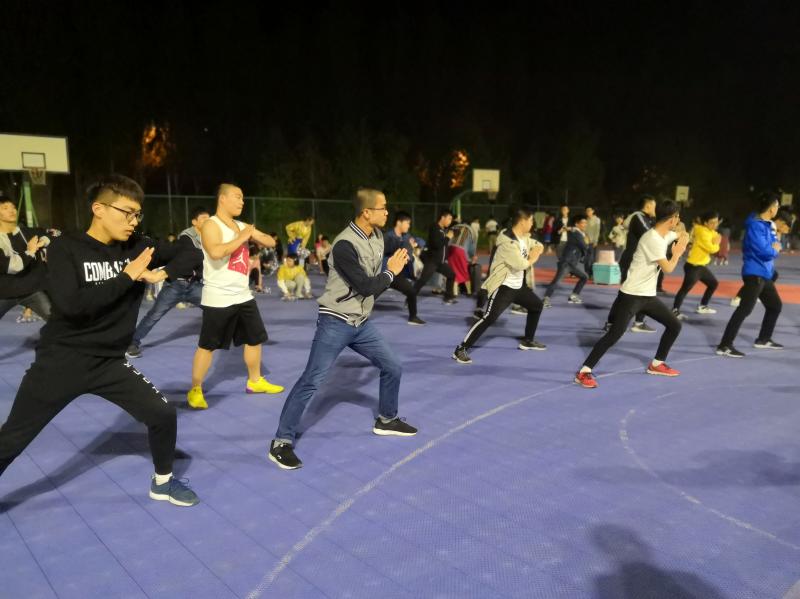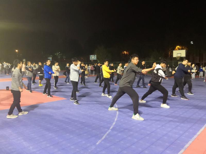 每晚九点整,32名男生准时来到集合地点开始训练。文艺部部员作为教练,耐心细致地讲解每一个动作要领,同学们仔细地聆听、认真地配合。随着一声声口号的起起落落,同学们凌乱的动作逐渐变得整齐划一,刚劲有力。大体训练过后,教练开始对每个同学的每个动作进行针对性指导,一次次的细心检查、一次次的耐心纠正、一次次的亲自示范,让同学们的动作质量得到了显著的提升。不积跬步无以至千里,不积小流无以成江河。训练接近尾声,再次合练时同学们步调一致,每一个动作皆有霹雷之势。同学们勤奋努力、团结奉献、刻苦训练的精神得到教练的认可和赞许,大家脸上都露出了欣慰的笑容。