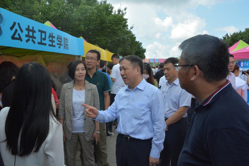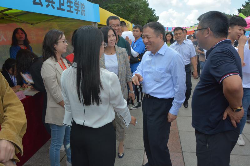 的迎新志愿者们、2019级新生及新生家长们表达了亲切的慰问,并向在场工作人员询问了新生报到情况及绿色通道办理情况。随后,书记对工作人员的辛勤工作、辛苦付出表示了肯定,并叮嘱新生及工作人员注意天气变化,保证饮食和休息。