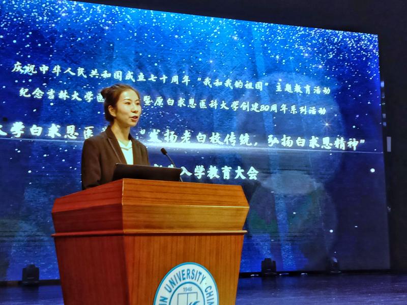 学生代表田奕欣向与会的各位领导和同学们介绍了在河北唐县葛公村的实践经历,讲述了活动中对白求恩精神的体悟和感受,赢得了台下领导和师生们的热烈掌声。大会最后,被评为吉林省优秀志愿者、2018年度临床医学院十佳大学生的学生代表宋知遥同学带领白求恩医学部2019级全体新生宣读医学生誓言。