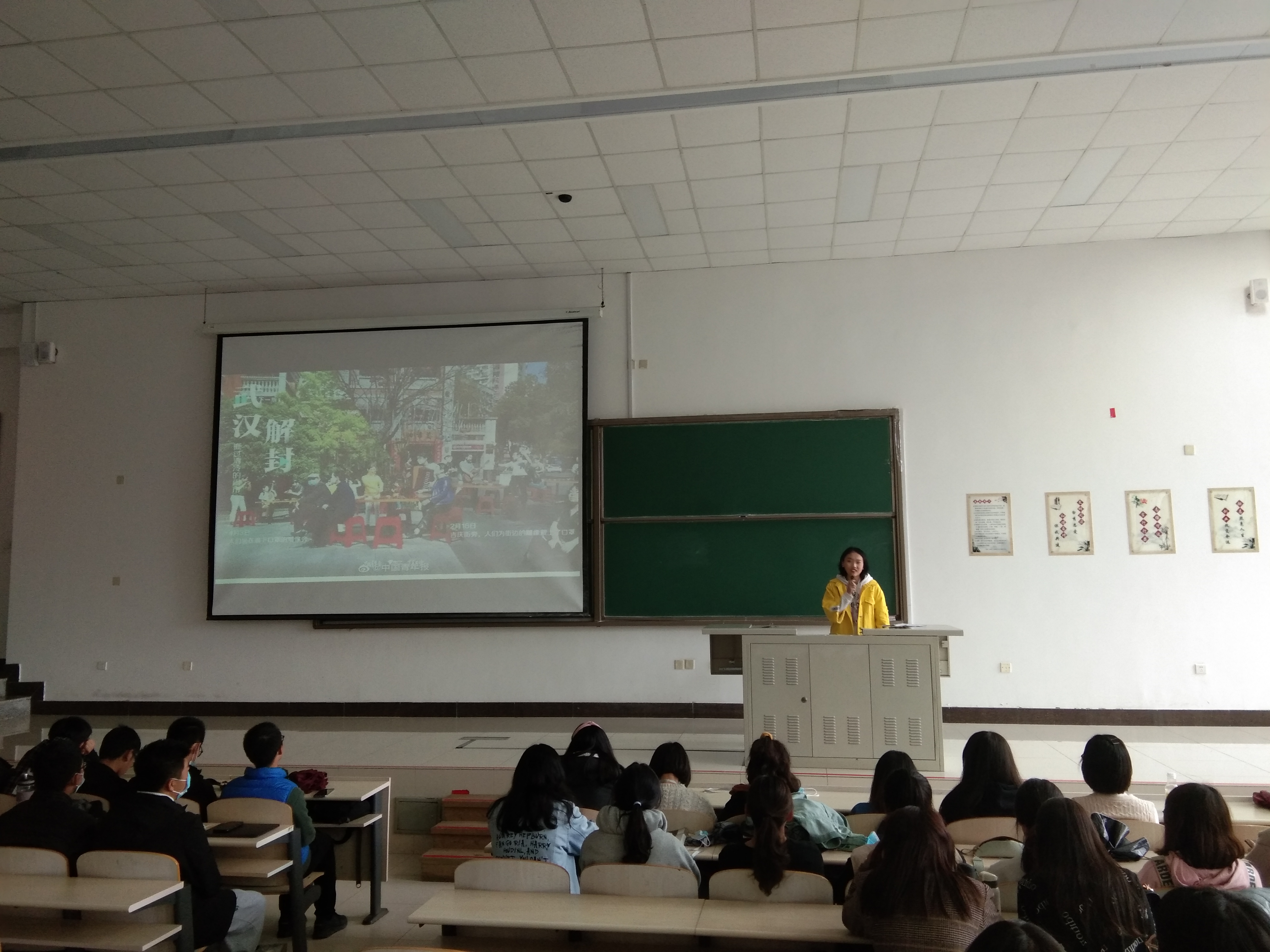 首先,本次班会主持人霍颖超介绍了疫情期间武汉基本的抗疫过程,并通过一个小视频同大家再次感受了全民共战疫的那些激动人心的瞬间。接下来由各位多才多艺的同学们送上精彩的节目。首先是蒋明函、法思睿、姚雨欣和洛松措姆共同为大家带来了诗朗诵《樱花依然盛开》。四位同学以饱满的感情,以武汉樱花为着眼点,向我们展示了一幅感人的共战疫情的画面。正如诗中所说“千年江城花开依旧,中华大地生生不息”,四位同学声情并茂的朗诵,展示了中华民族的伟大。随后,丁禹达同学上台浅谈了疫情中的死亡、亲情与爱。丁禹达同学结合清华大学某位武汉籍同学的演讲和他个人的经历,从预防医学专业角度阐释了疫情带给我们的启发。